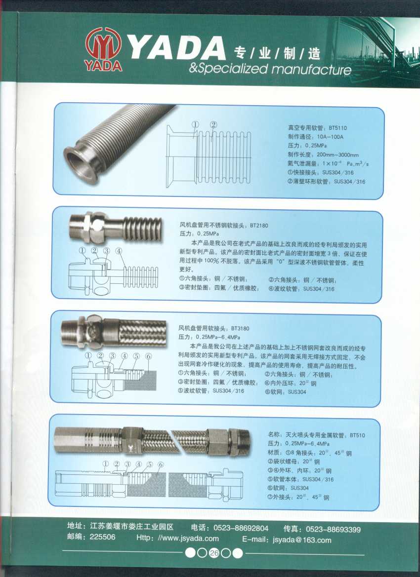 秉天時 籍地利 仰人和 虔誠一個永恒的理念,創(chuàng)新永續(xù).百諾不如一信,亞達人堅持以信為本,視客戶如同上帝,把對信譽的追求,體現(xiàn)在嚴(yán)格的質(zhì)量控制和完善的客戶服務(wù)上,讓客戶百分之百滿意是亞達人不變的信念。 本廠系ISO9001質(zhì)量認證企業(yè)、計量合格企業(yè)。本廠專業(yè)致力于生產(chǎn)不銹鋼金屬波紋軟管、超高壓、高壓膠管、波紋管補償器(膨脹節(jié))、立式、臥式、冷卻器。本廠產(chǎn)品具有承受壓力高、彎曲半徑小、抗疲勞性能強、使用壽命長等特點。廣泛應(yīng)用于電力、石化、冶金、水泥建材、工程機械、礦山及液壓系統(tǒng)。產(chǎn)品暢銷全國各地。 今日亞達之成功源自諸多客戶的厚愛,明天的輝煌更離不開您對我的支持與信賴。查看更多>>